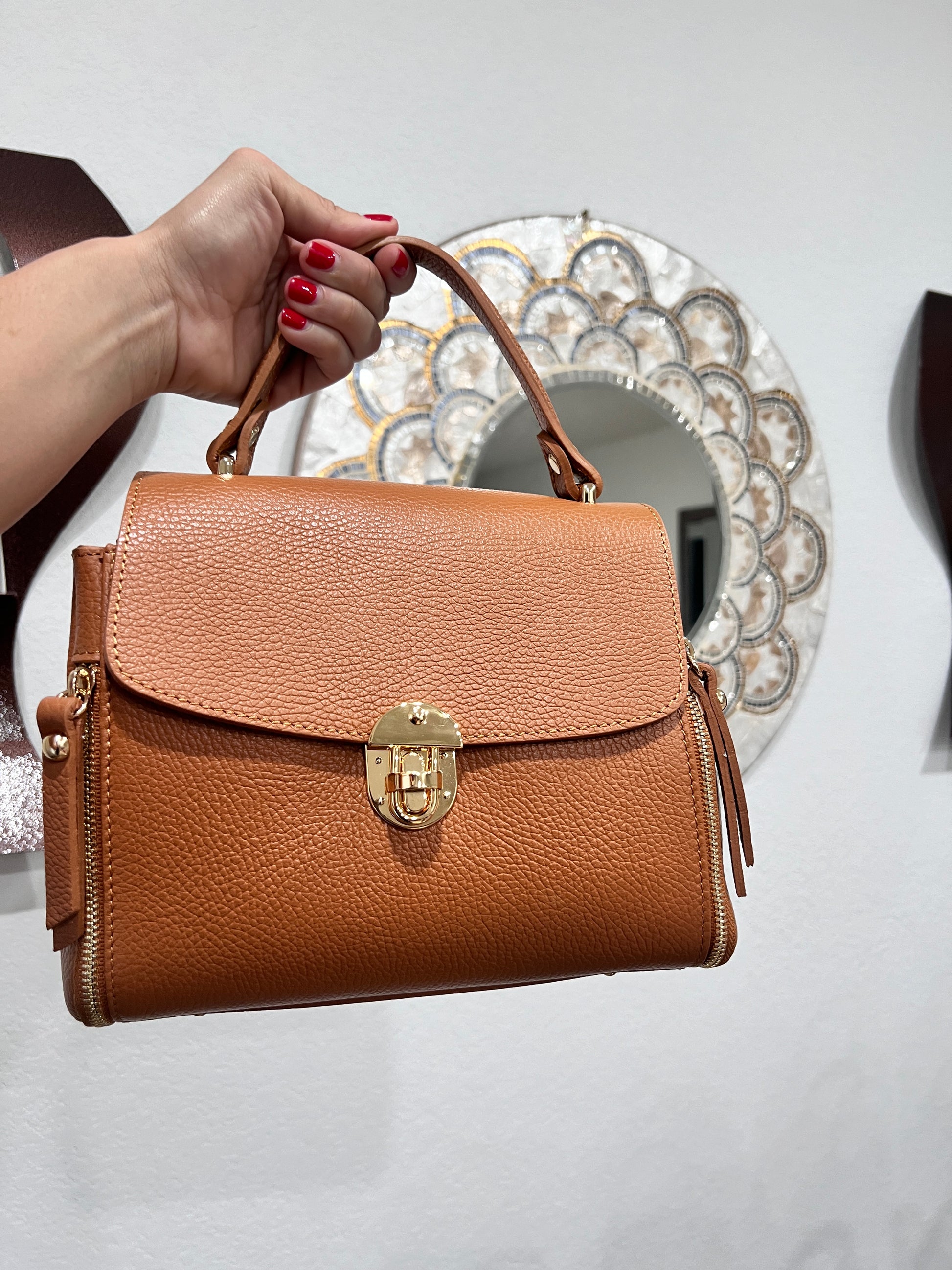 The MANUELA could be a shoulder or crossbody bag. Be sure this bag will bring glamour to your formal & casual outfits. It comes with an adjustable leather strap for crossbody. It could also be hold just by the handle. Zippers in the outside are not real.