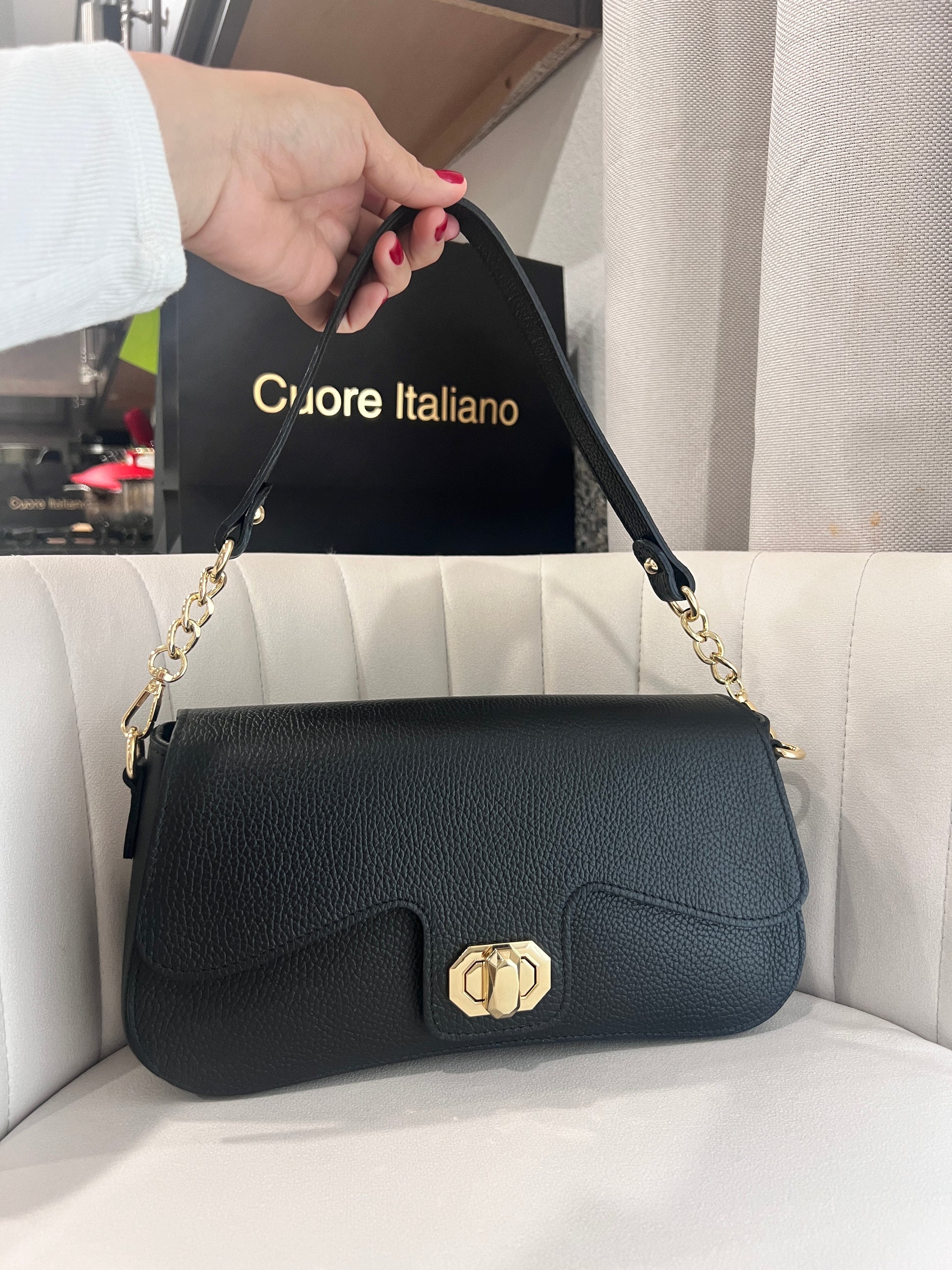 Spacious main compartment enough for most needed items, such as: cloths, iPhone pro max, notebook, makeup, mirror, glasses, keys, wallet/cards, cash, AirPods, etc. It comes with internal zipper. Plenty of room to carry several things at the same time. Easy to clean interior. Hardware has MADE IN ITALY engraved.